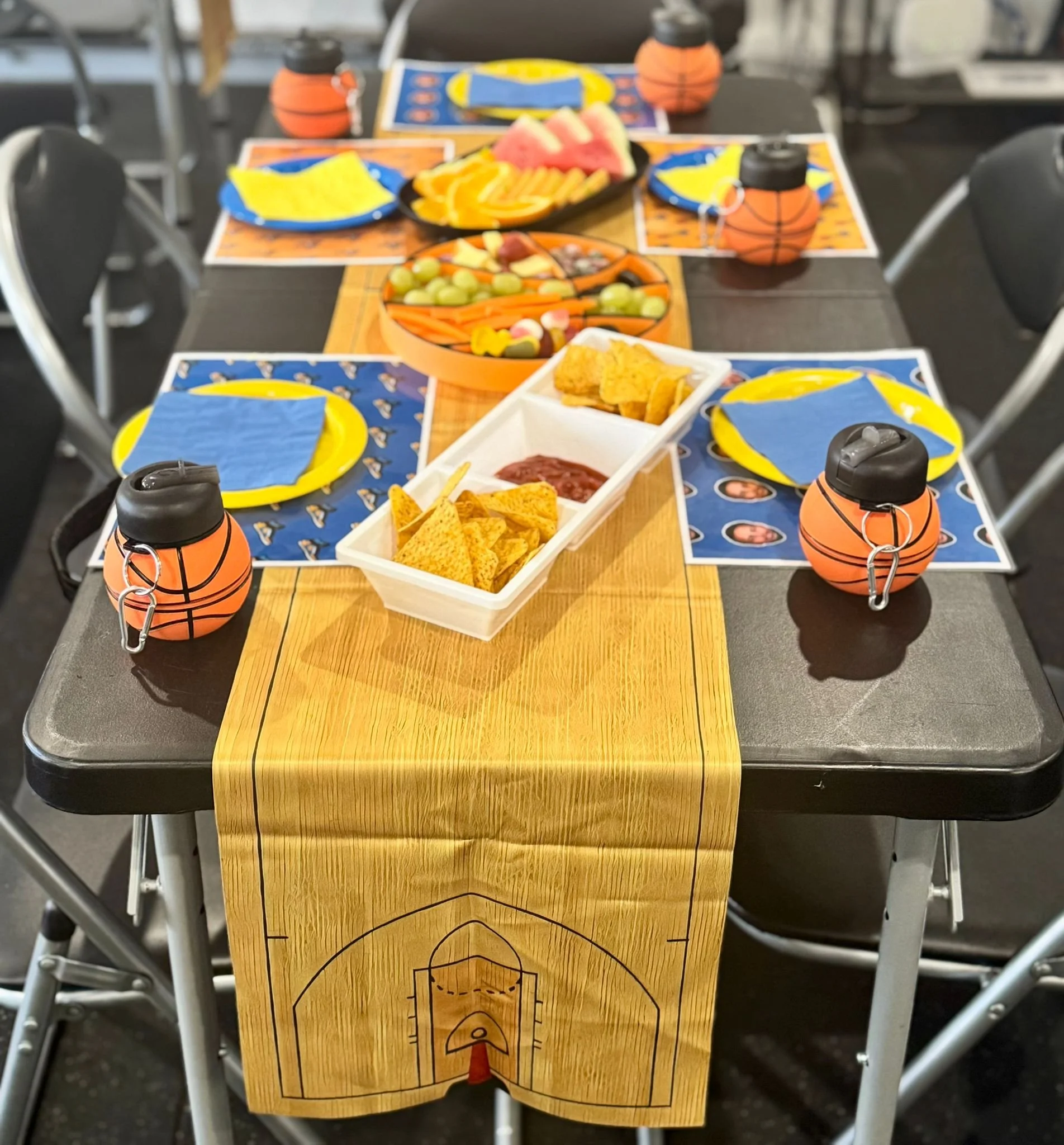 • Buffet-style party room setup for easy access to food & shooting hoops